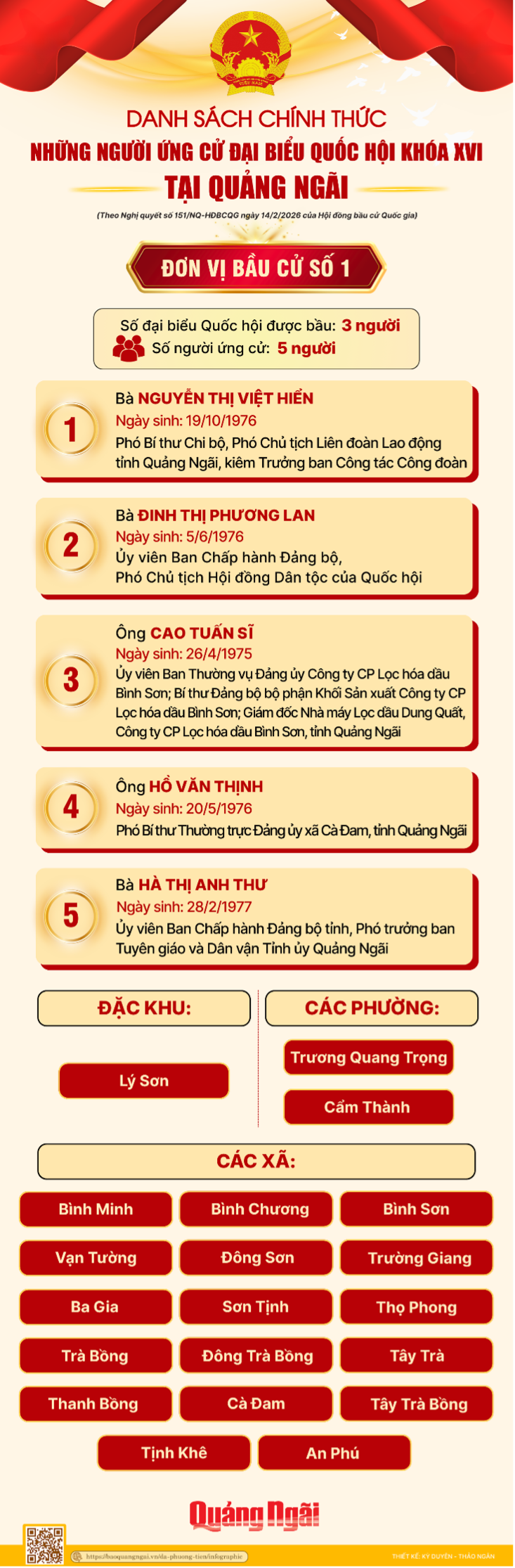Tham gia ứng cử đại biểu Quốc hội tại đơn vị bầu cử số 1 tỉnh Quảng Ngãi có 5 ứng viên gồm: bà Nguyễn Thị Việt Hiền – Phó Bí thư Chi bộ, Phó Chủ tịch Liên đoàn Lao động tỉnh Quảng Ngãi, Kiểm Trưởng ban Công tác Công đoàn; bà Đinh Thị Phương Lan – Ủy viên Ban Chấp hành Đảng bộ, Phó Chủ tịch Hội đồng Dân tộc của Quốc hội; ông Cao Tuấn Sĩ – Ủy viên Ban Thường vụ Đảng ủy Công ty cổ phần Lọc hóa dầu Bình Sơn, Bí thư Đảng bộ bộ phận Khối Sản xuất Công ty cổ phần Lọc hóa dầu Bình Sơn, Giám đốc Nhà máy Lọc dầu Dung Quất; ông Hồ Văn Thịnh – Phó Bí thư Thường trực Đảng ủy xã Cà Đam, tỉnh Quảng Ngãi; bà Hà Thị Anh Thư – Ủy viên Ban Chấp hành Đảng bộ tỉnh, Phó Trưởng ban Tuyên giáo và Dân vận Tỉnh ủy Quảng Ngãi.