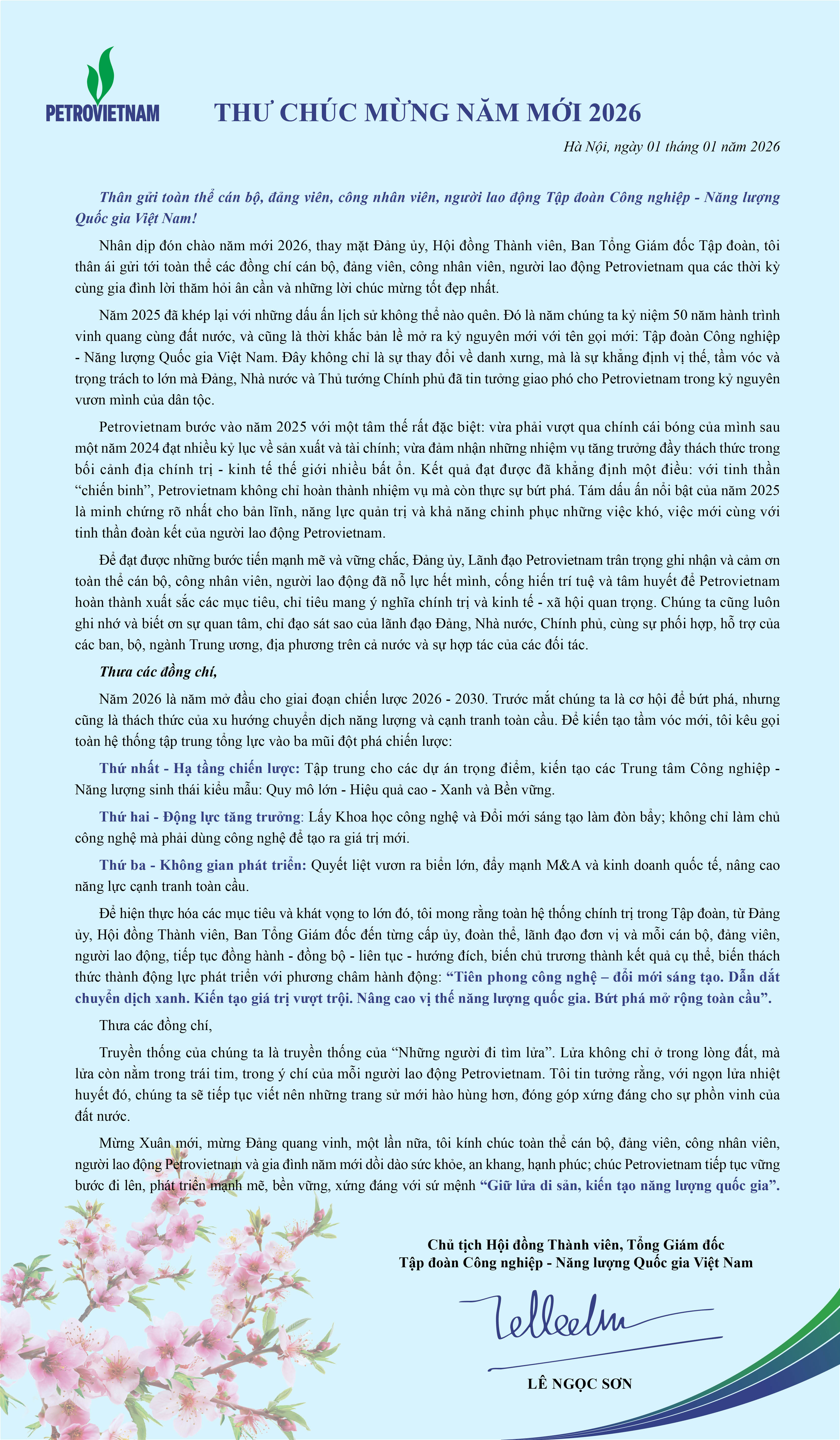 Thư chúc mừng năm mới 2026 của Chủ tịch Hội đồng Thành viên, Tổng Giám đốc Tập đoàn Công nghiệp - Năng lượng Quốc gia Việt Nam